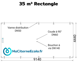L'installazione di una cisterna per la raccolta di acqua piovana da 35.000 litri non richiede accessori particolari. È sufficiente preparare il terreno per accogliere il sistema di stoccaggio nelle migliori condizioni e collegare un collettore di grondaie ai pluviali. Una pompa per garantire il corretto flusso di distribuzione dell'acqua piovana è essenziale se si opta per questa cisterna di grande capacità. Infine, se si prevede di collocare la cisterna sotto un vespaio standard, è possibile collegare il sistema di troppopieno a una presa di corrente (questo accessorio di collegamento non è fornito con la cisterna da 35 m3 ).